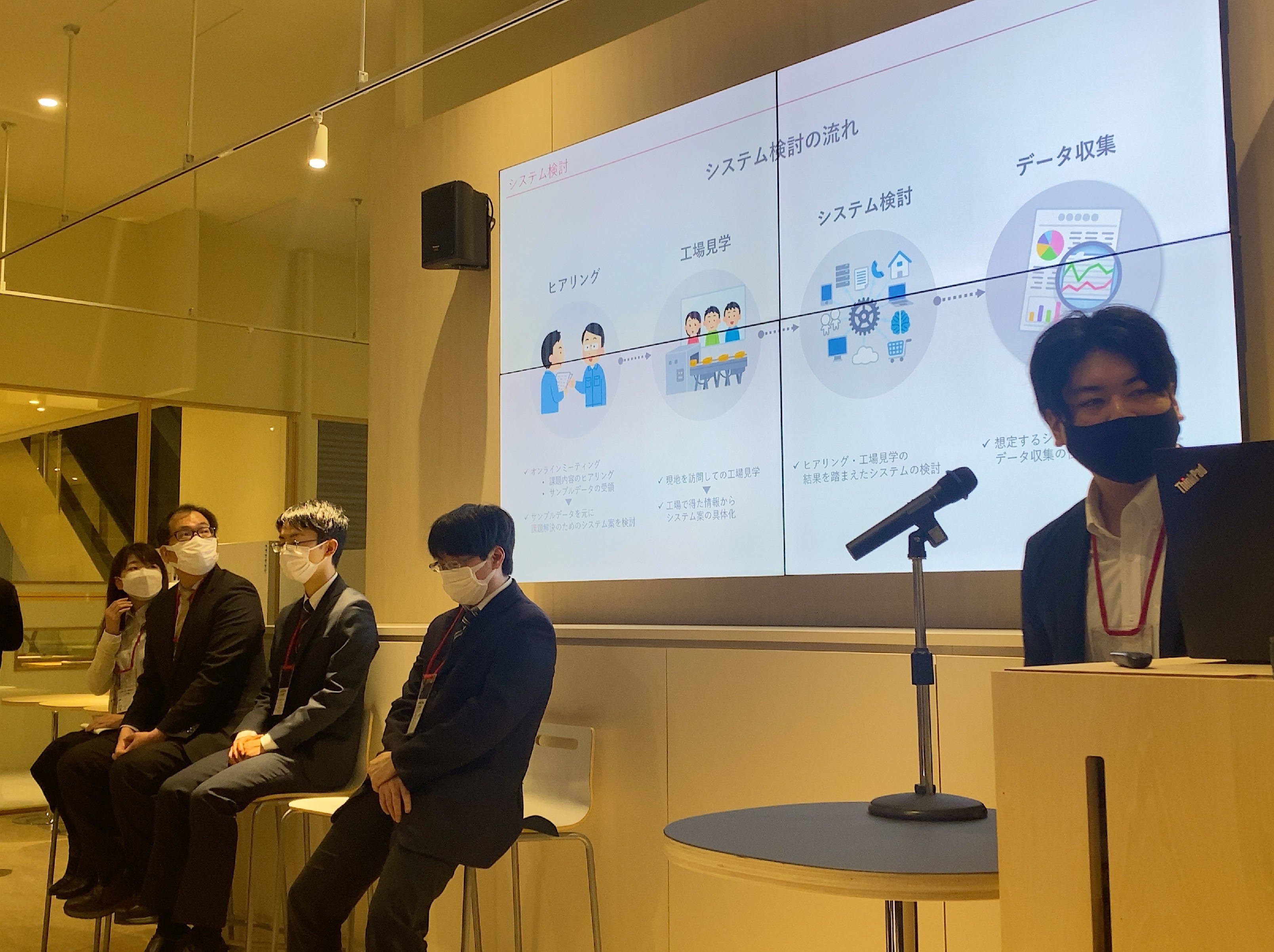 本成果発表会では、各チームでの取組の発表を行い、課題提供企業様にも過剰にお越しいただき、コメントなどいただきました。