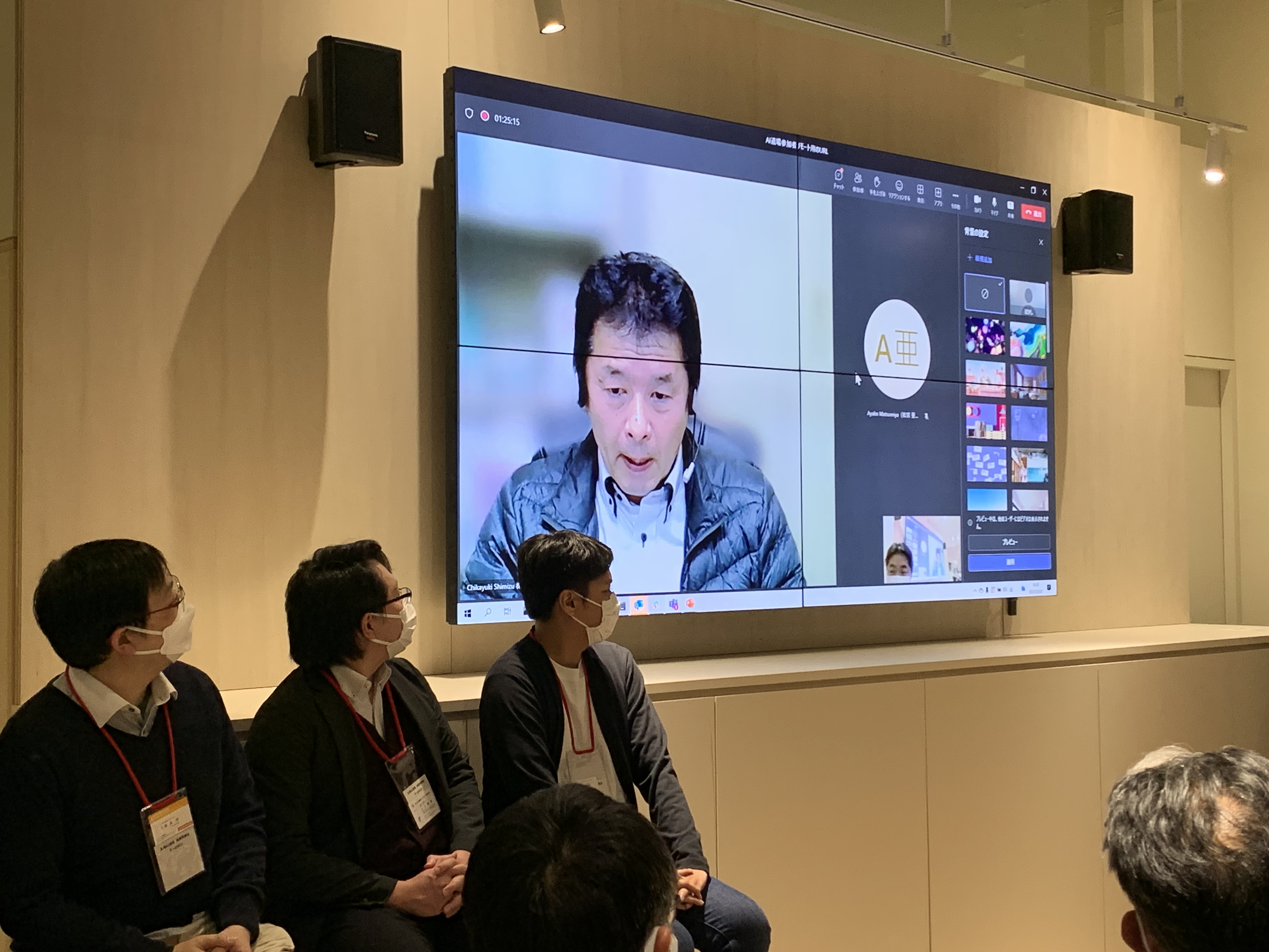 多くの聴講者と共に、札幌市副市長さま、課題提供企業さま、成果発表をする3チームの面々と、取材陣の方々が集まっていました。